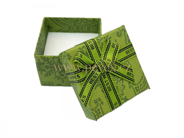 Papírová krabička na šperky s potištěnou mašlí. Molitanová vložka s průseky pro prsten nebo náušnice.