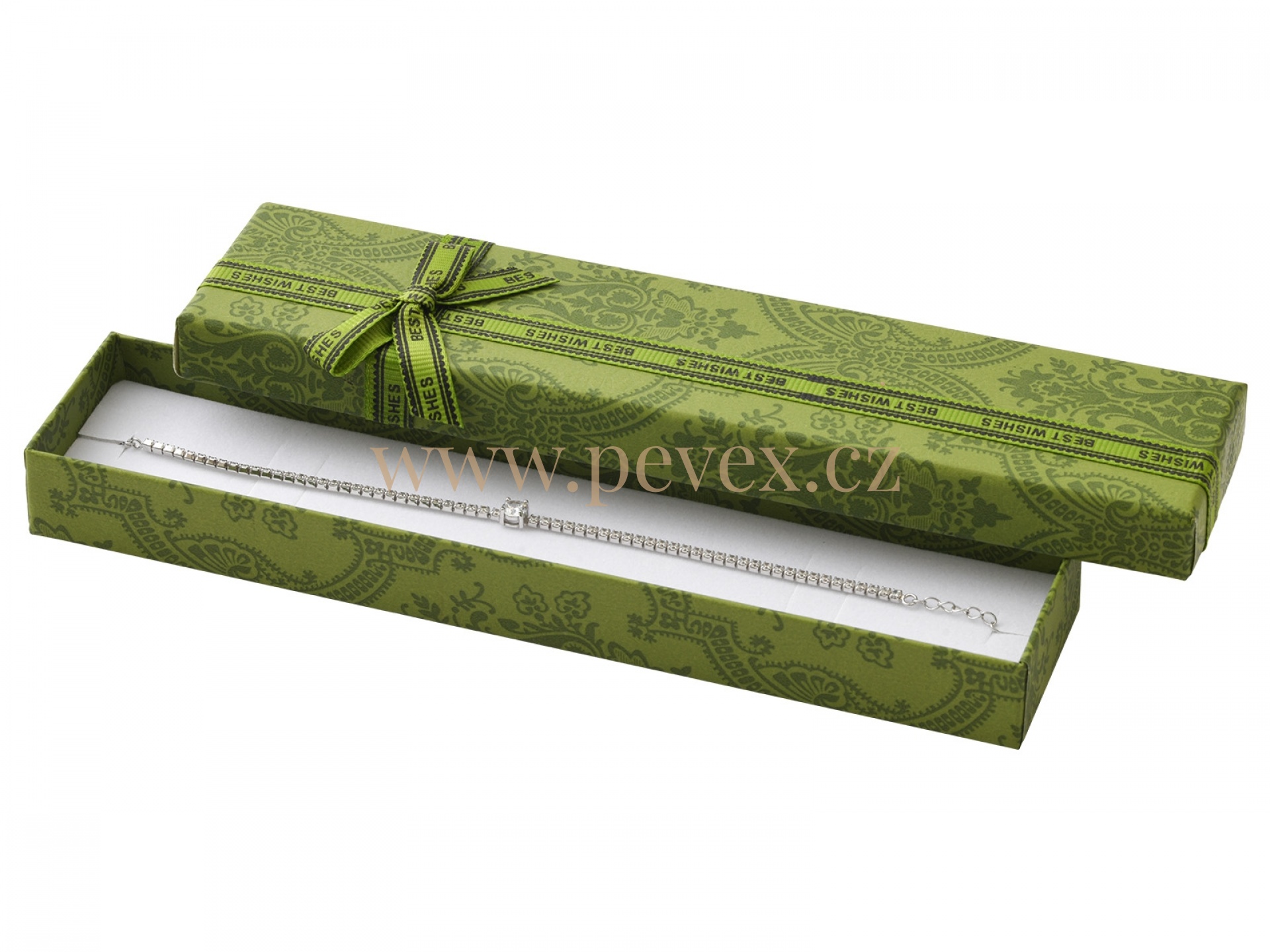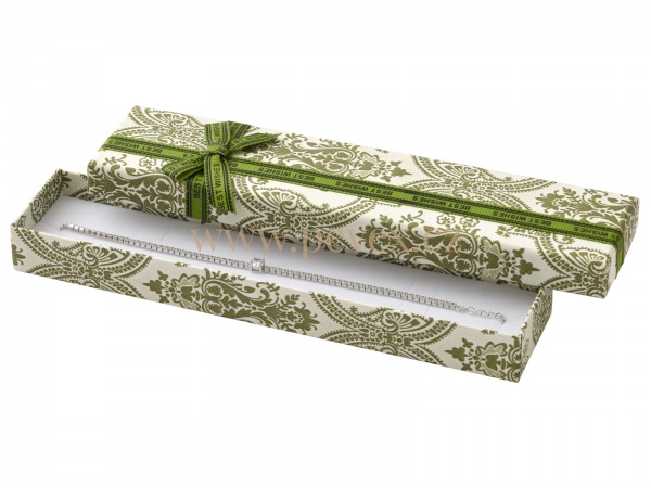Papírová krabička na náramek s potištěnou mašlí. Molitanová vložka s průseky.