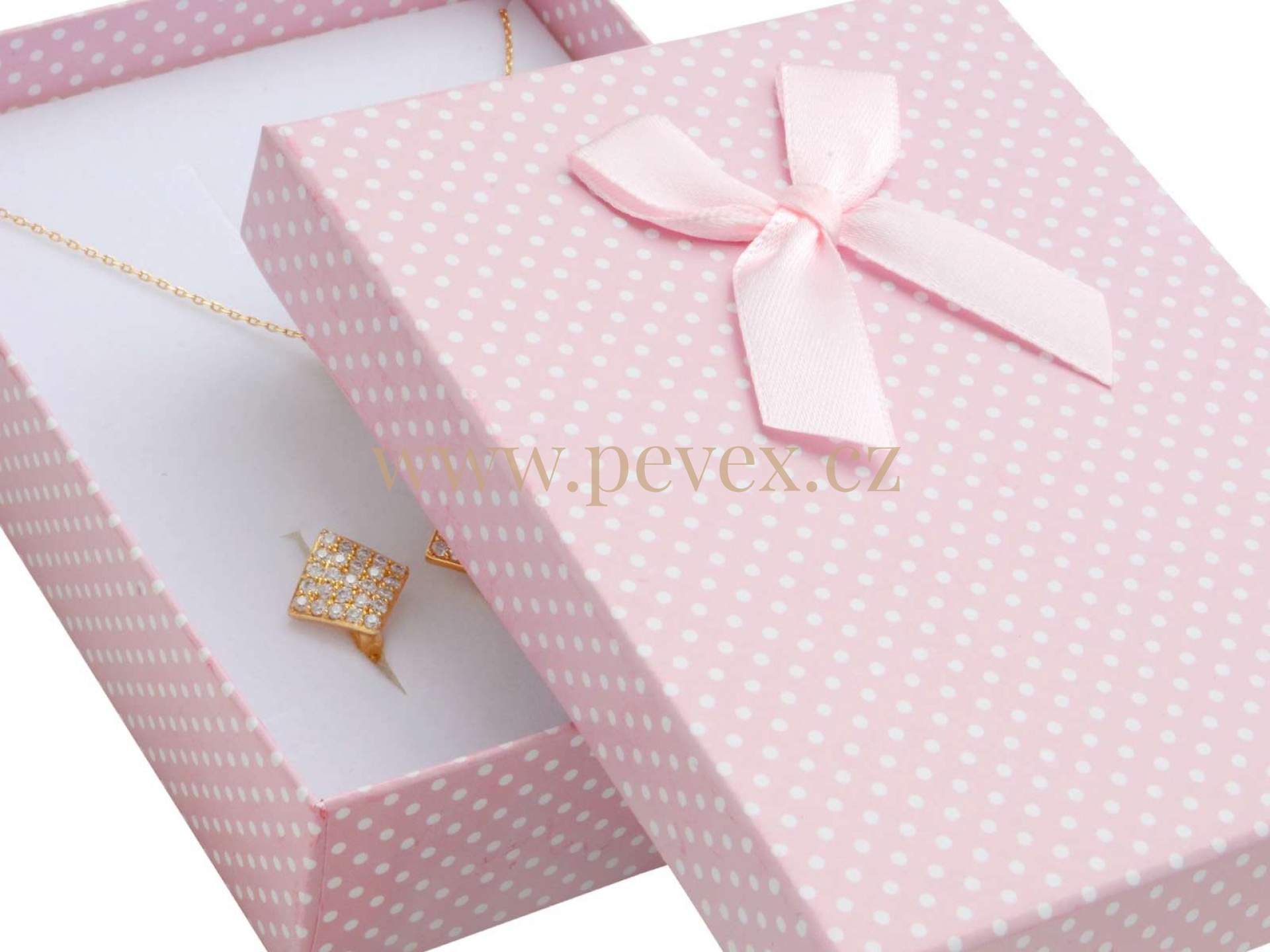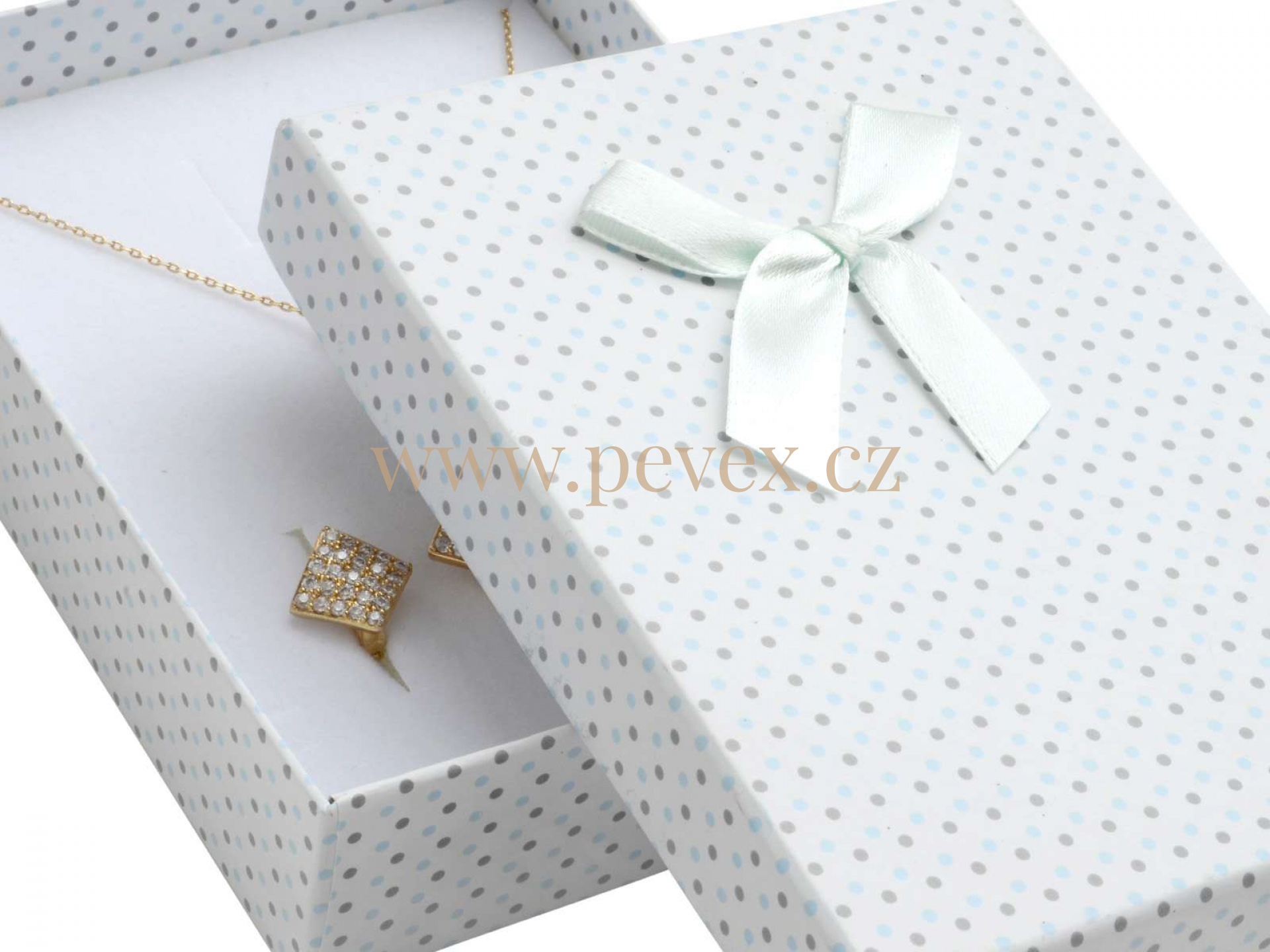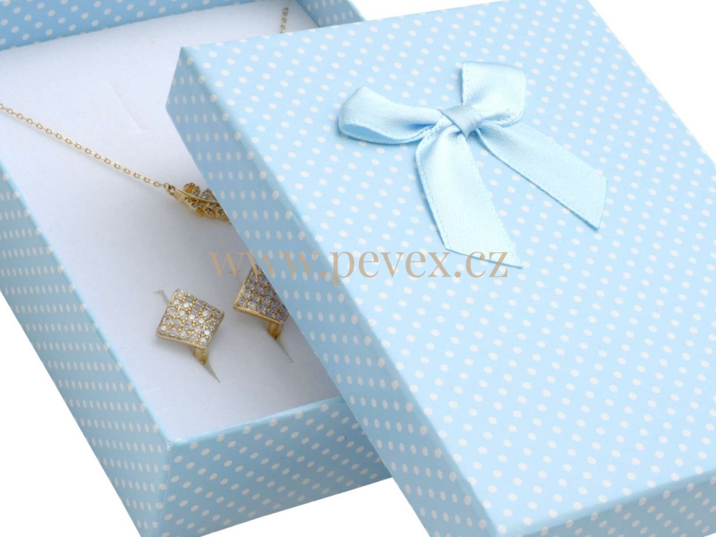 Papírová krabička se saténovou mašlí. Molitanová vložka pro velkou sadu šperků.