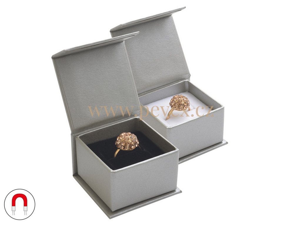 Papírová krabička s magnetickým uzávíráním. Molitanová vložka s bílou/černou úpravou s průseky na prsten.