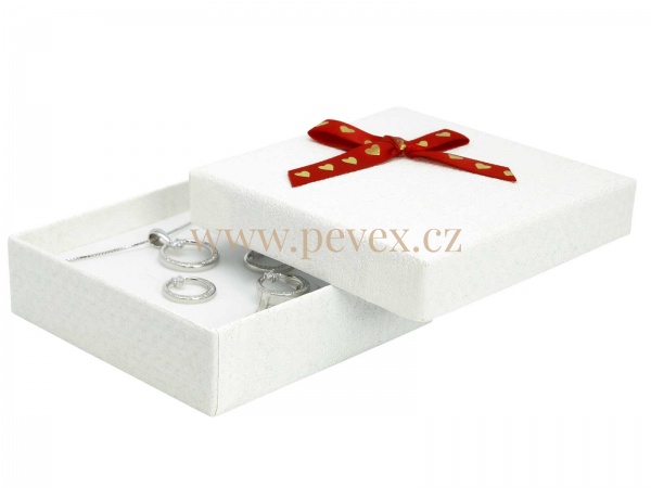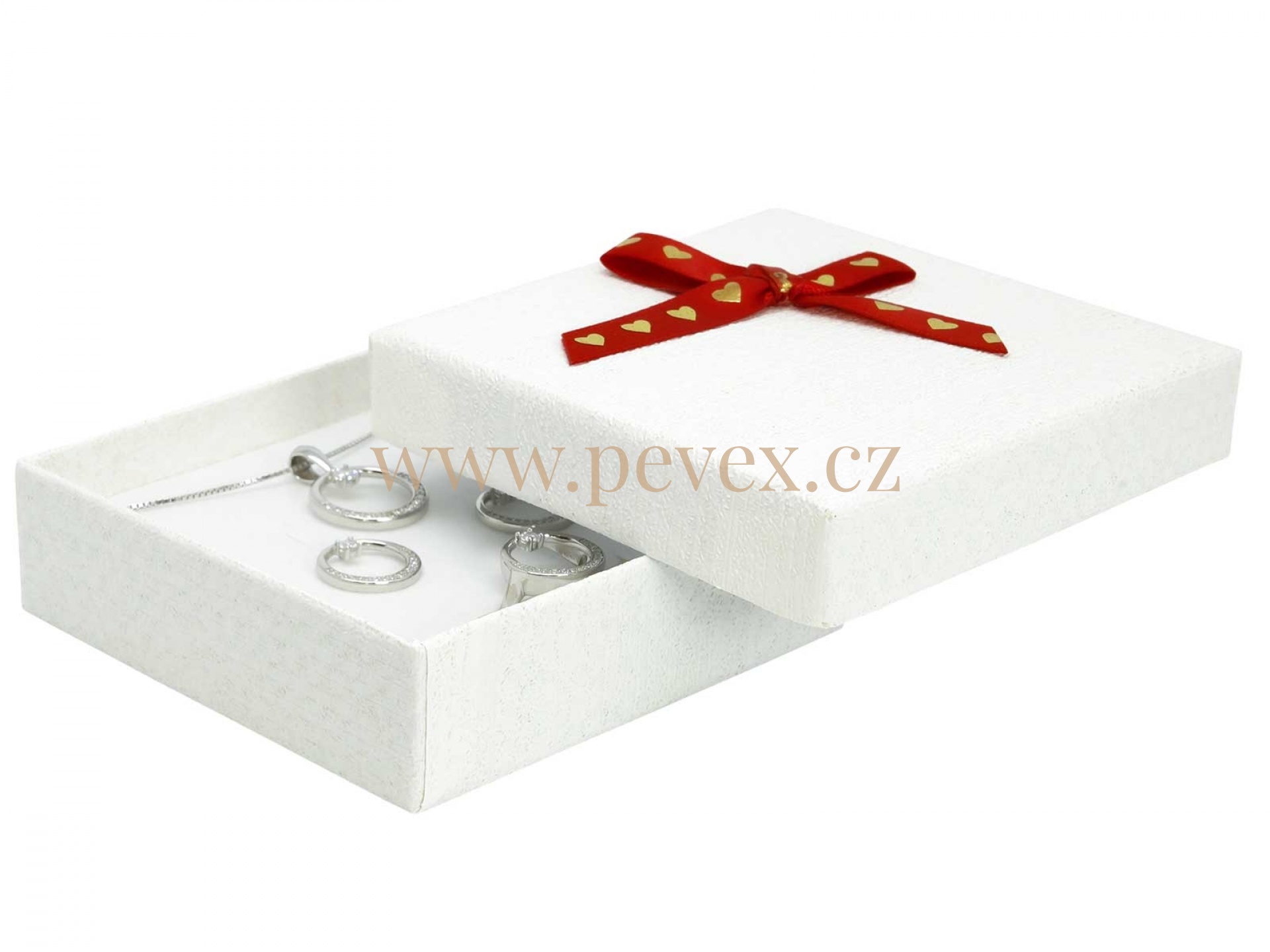 Papírová krabička s mašlí potištěnou srdce. Molitanová vložka s průseky na střední sadu šperků.