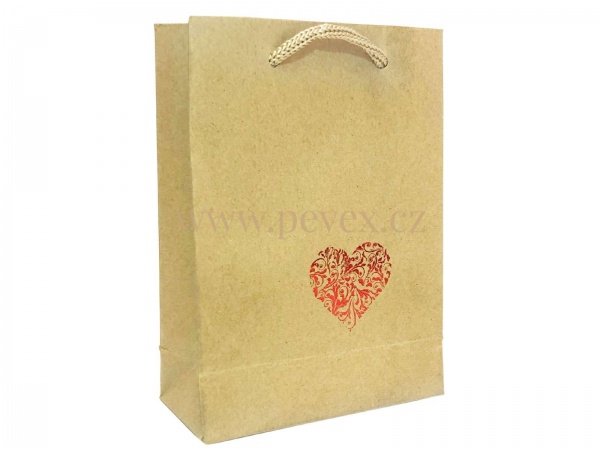 Papírová taška z přírodního papíru s potiskem srdce. Ucha z pletené šňůrky.