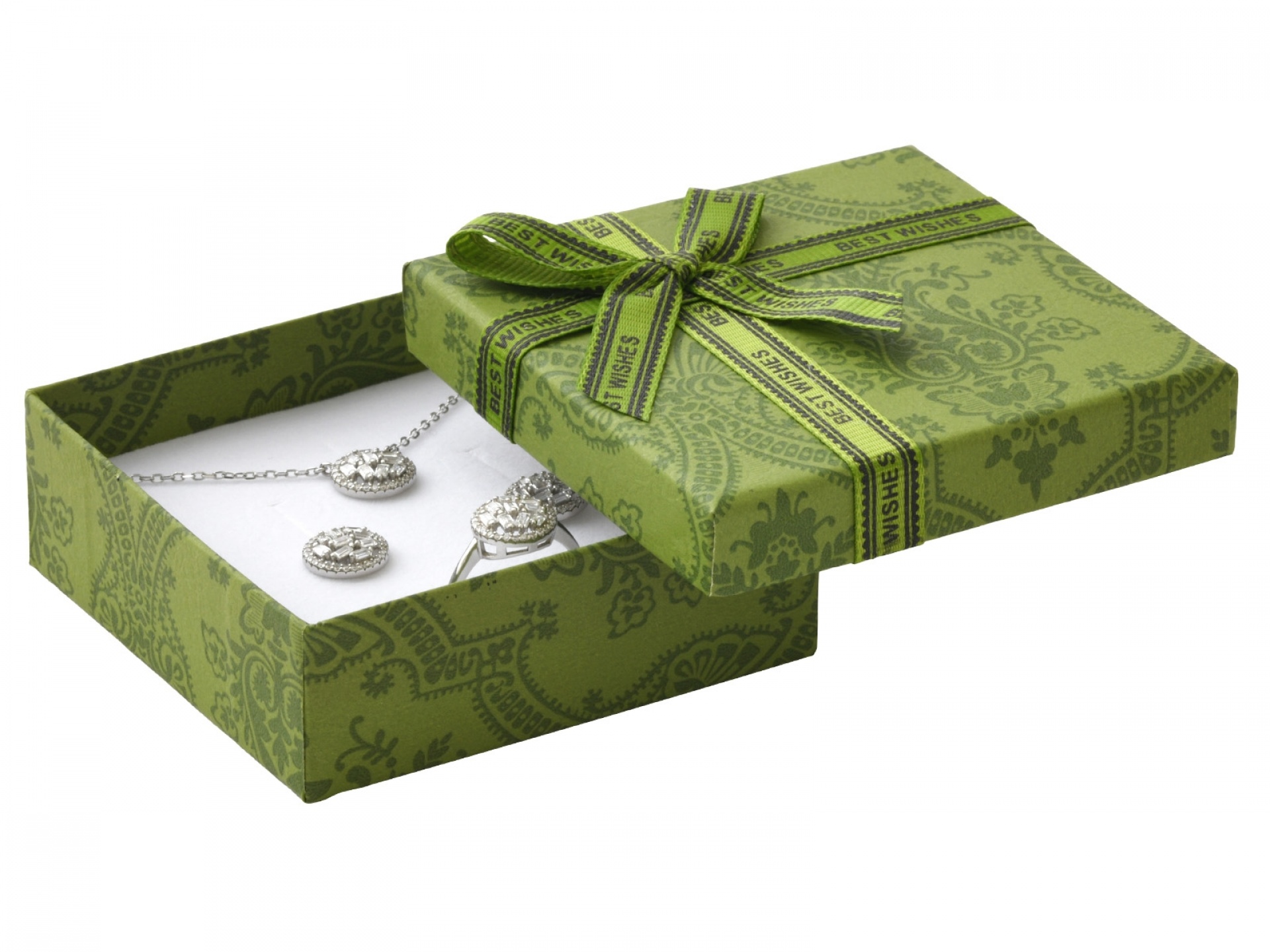 Papírové krabičky s potištěnou mašlí. Molitanová vložka s průseky na šperky.